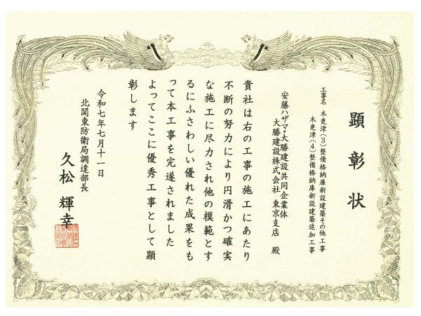 弊社が㈱安藤・間と共同企業体(JV)を組み施工を担当いたしました工事につきまして、防衛省北関東防衛局より「優秀工事表彰」を賜りましたので、ご報告申し上げます。