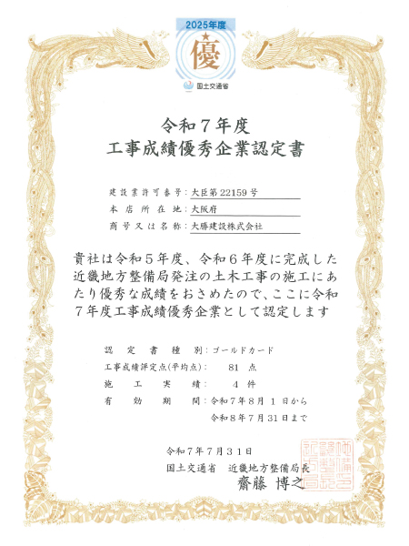 国土交通省近畿地方整備局より「工事成績優秀企業認定書」を賜りましたので、ご報告いたします。