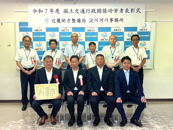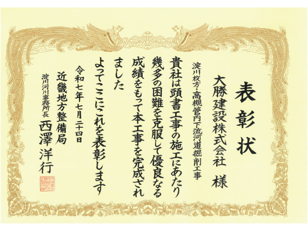 当社施工工事につきまして、令和7年7月24日付で近畿地方整備局 淀川河川事務所より優秀工事表彰を頂きました。