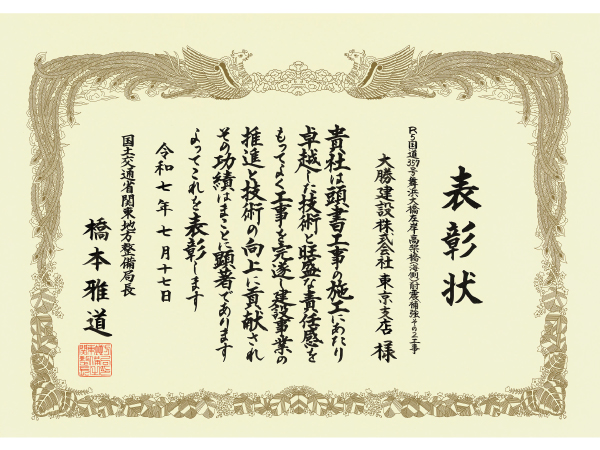 弊社施工工事につきまして、関東地方整備局、横浜国道事務所より表彰を頂きました。