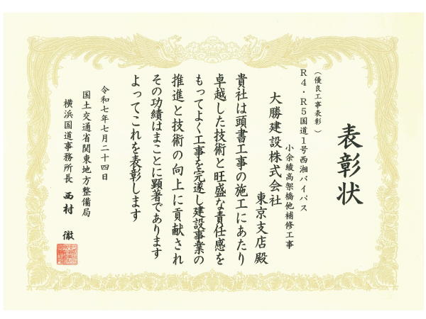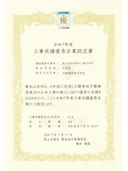国土交通省関東地方整備局より令和7年度「工事成績優秀企業認定書」をいただきましたのでご報告いたします。