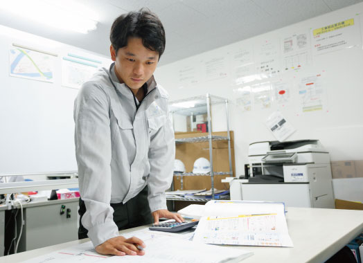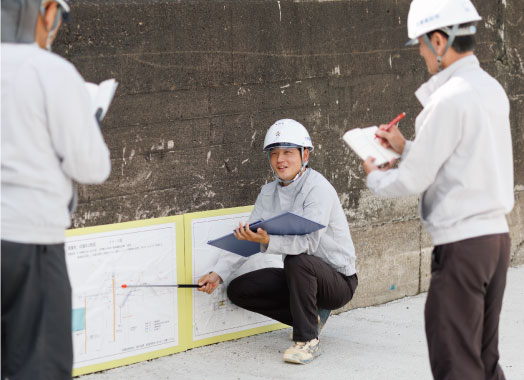 研修期間を経て、土木部で施工管理の仕事を実地で学んでいます。時に仕事は厳しく、泥だらけになることもありますが、大きなやりがいを感じています。経験豊富で面倒見のいい先輩方に仕事のノウハウを教えてもらい、協力し合って抜群のチームワークを発揮しています。