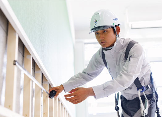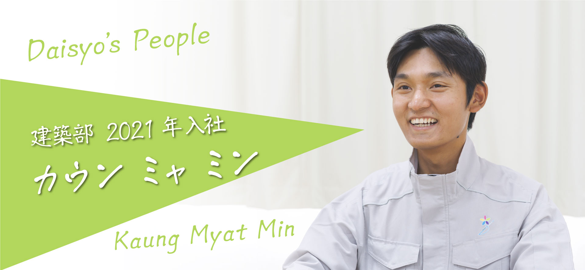 私はミャンマー出身で日本に暮らして10年目。最初の5年は学校で語学と建築について学び、大勝建設に入社して5年目となります。現在は大阪市内にある学校の増改築の現場で働いています。日本語はマスターしましたが、現場では建築の専門用語が飛び交っています。それを覚えるのが結構難しかったですね。